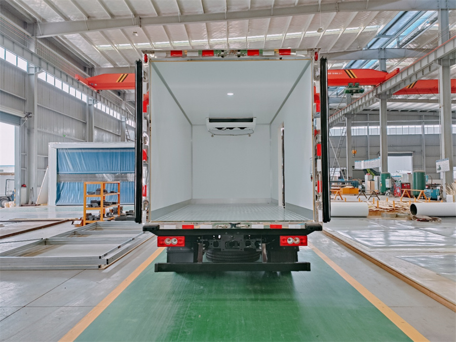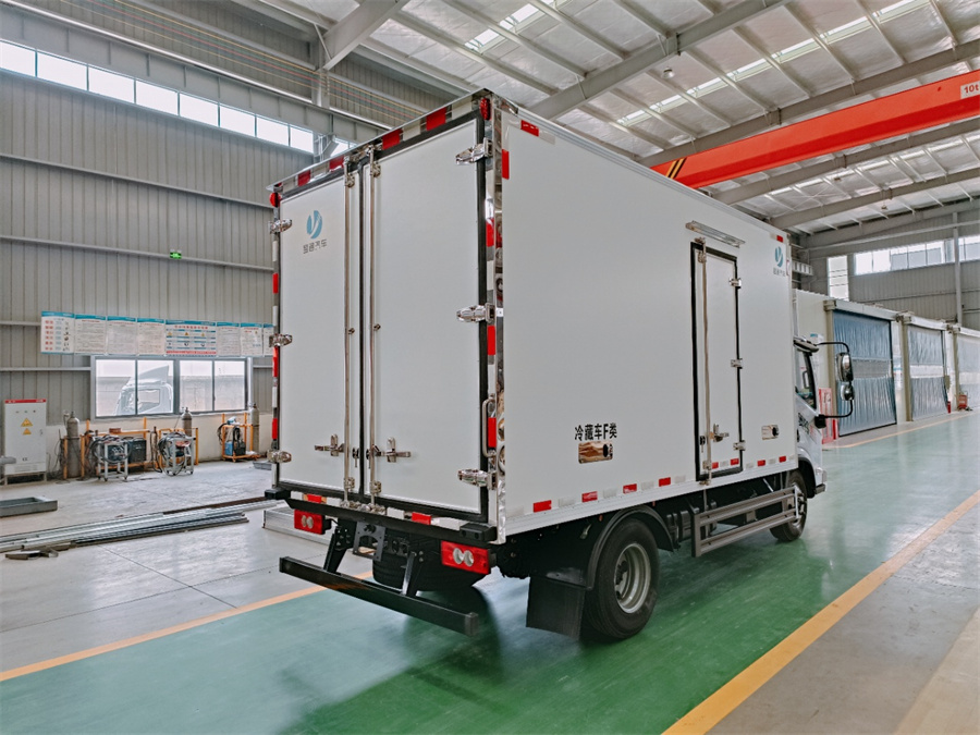 廂體采用內外玻璃鋼材料制作,中間夾層為高密度保溫材料,用真空復合一次成型,表面光潔平整,強度高,使用壽命長(cháng),廂體邊緣采用優(yōu)質(zhì)鋁合金包邊和專(zhuān)用密封膠處理,具有重量輕、保溫、密封效果好等特點(diǎn)。門(mén)框鎖件為不銹鋼材質(zhì),門(mén)四周用一次成型密封條密封,廂體外形平整美觀(guān),車(chē)廂頂部加以雨檐,避免下雨天雨水對車(chē)廂的浸泡,延長(cháng)廂體使用壽命,車(chē)廂內配有人性化照明系統。穩固性和氣密性是普通冷藏車(chē)廂體不可比的,并且具有質(zhì)量輕,抗沖擊力強,無(wú)滲透等優(yōu)點(diǎn)。配備國產(chǎn)580制冷機組。